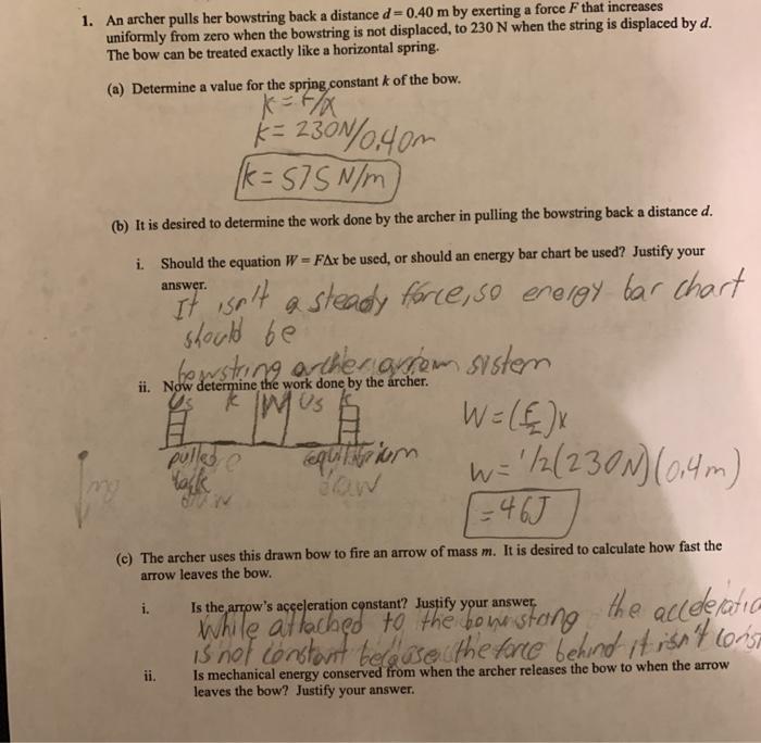 An Archer Pulls Her Bowstring Back 0 400 M By Exerting A Force That Increases Uniformly From Zero To 230 N A What Is The Equivalent Spring Constant Of The Bow B